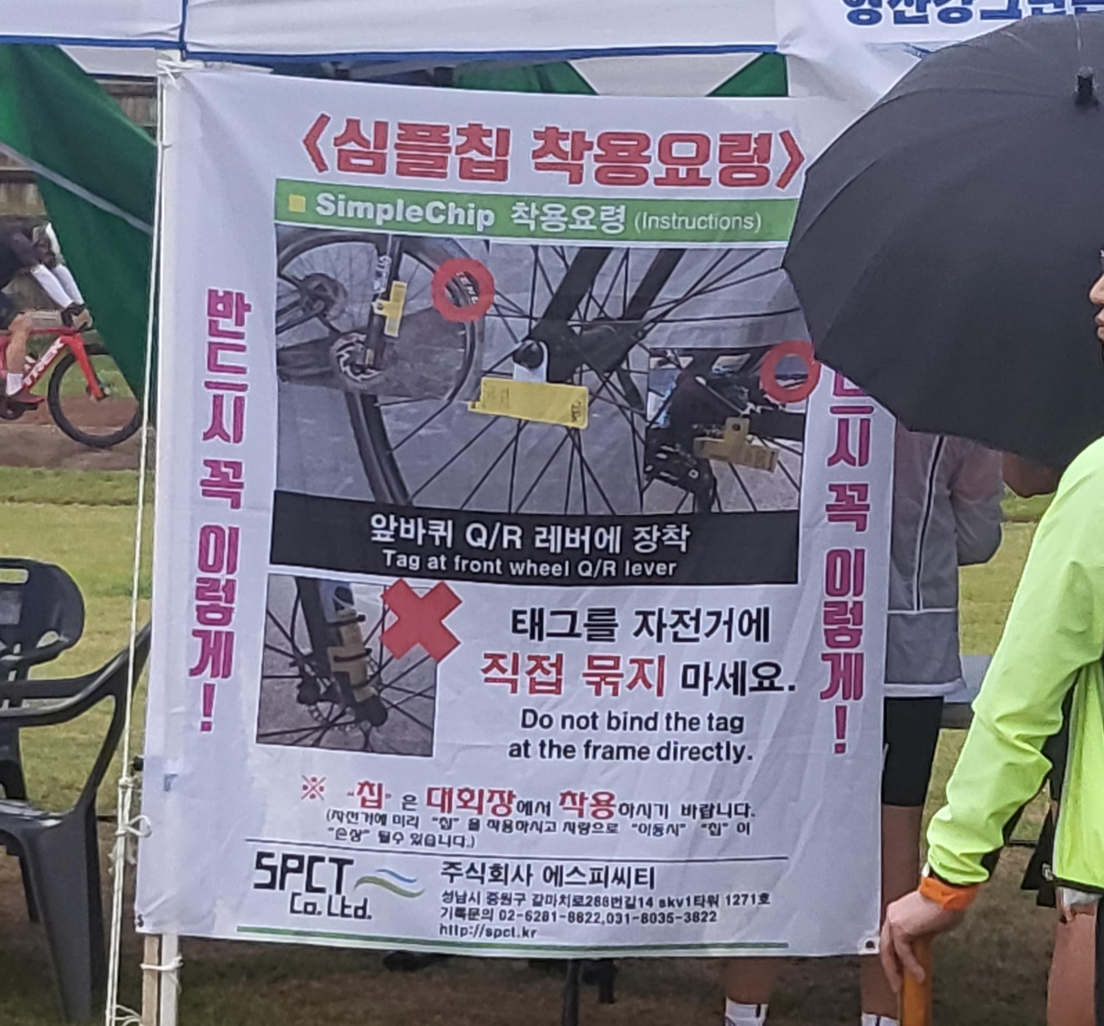 태그를 액슬에 꼽고 배번표도 꽃았다. 태그를 자전거에 직접 묶지 말라고 한다.. ㅎㅎ