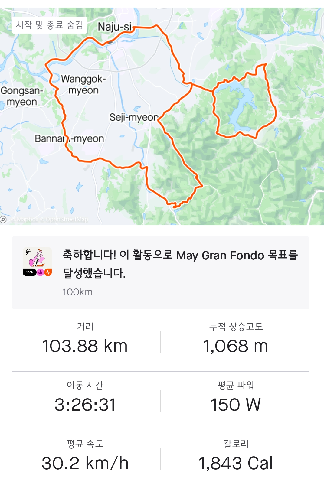 총거리 104km에 스트라바에는 획고 1040m로 찍혀있었다.