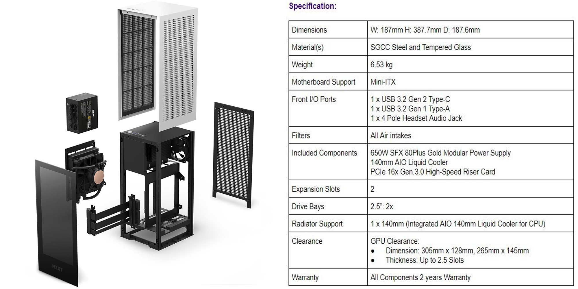 NZXT H1의 공식적인 스펙이다.