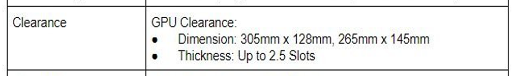 공식 스펙에는 호환되는 GPU Clearance를 305x128, 265x145로 잡고있는데.. 이 부분을 헷갈려서는 안된다.