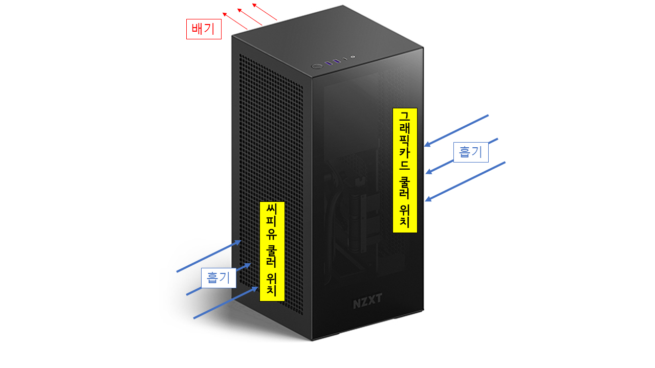 NZXT H1 케이스의 쿨링 구조는 위 사진과 같다.