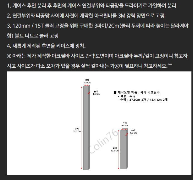 그 사이에 주문 제작한 아크릴 막대기를 끼워서 아크릴 막대기로 삽입으로 늘어난 공간에 120mm / 15T 사이즈의 팬을 위아래로 2개 삽입하여 위 사진과 같이 돌아가게끔 만들어놨다.