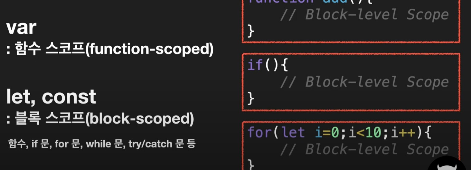 * 블록 스코프: 모든 선언문은 코드 블록 내에서만 유효