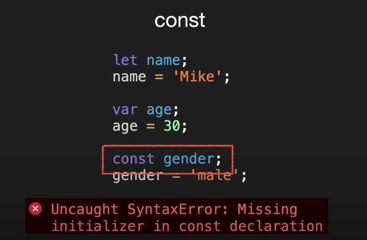 선언 : var는 선언과 초기화를 동시에. (할당전 호출 시, undefined) // let은 선언과 초기화가 분리 (초기화는 실제 코드에 도달햇을때 동작) // const는 선언 초기화 할당 동시에