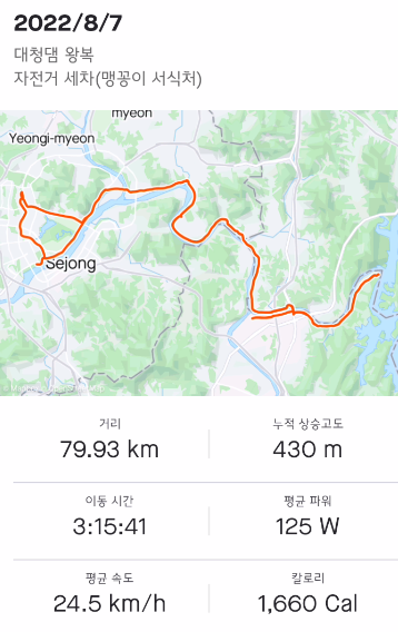 중간에 한 1번 쉬고.. 대청댐 클라이밍도 타고 올라가고 왕복 코스도 무사히 돌아왔다.