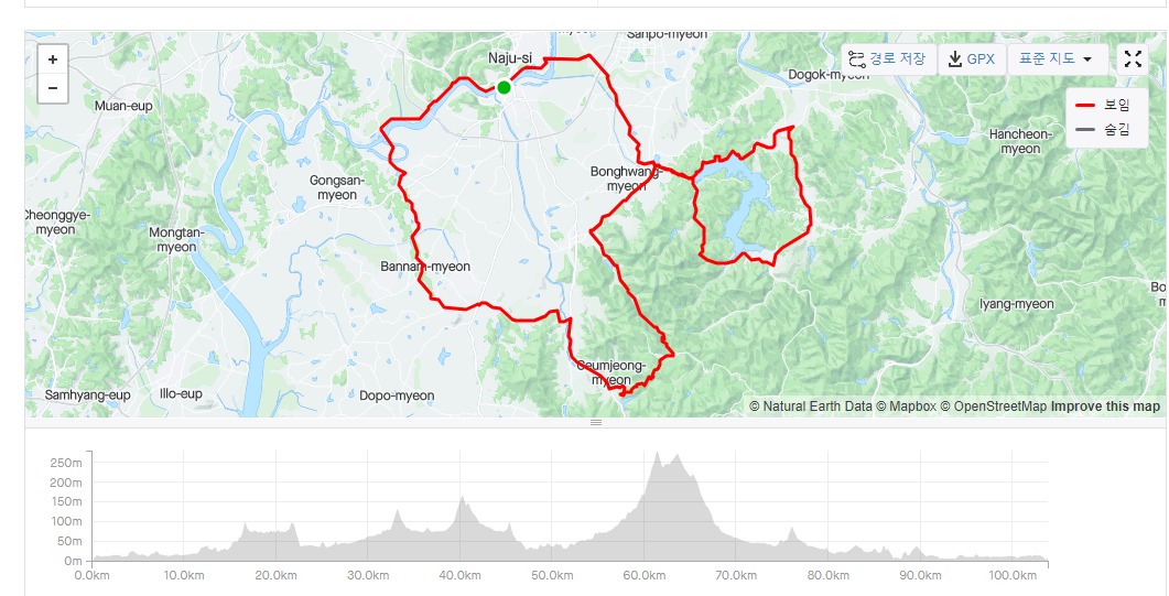 나름 큰 업힐은 60km 지점에 덕곡리 내산 업힐 정도 밖에 없고 나머진 거의 깔딱이라고 봐도 무방해서